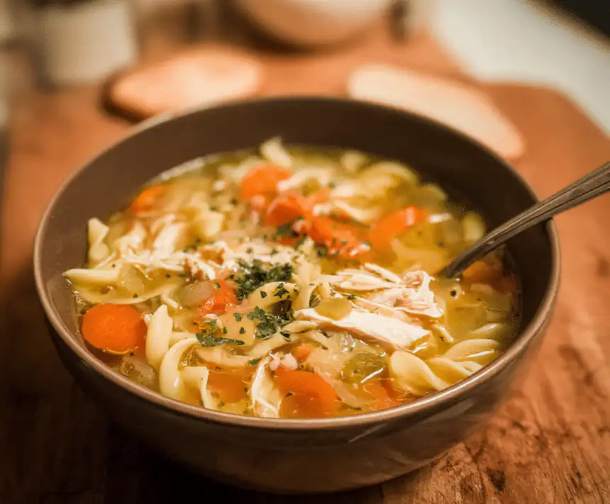 This easy chicken noodle soup is ready in 30 minutes with tender chicken, noodles, and classic vegetables for comforting homemade flavor.