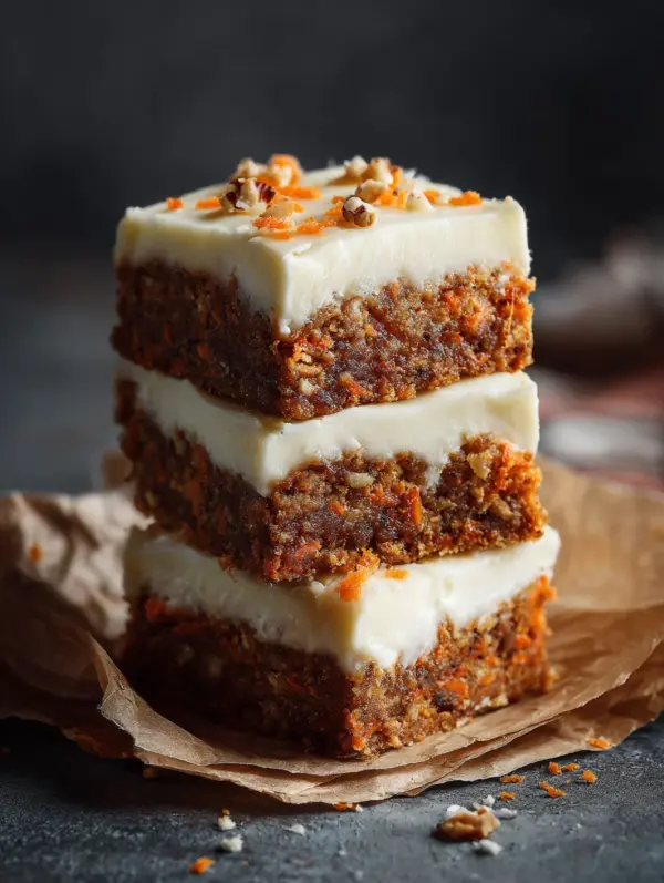 Dust these cream cheese bars carrot cake with powdered sugar and serve at room temperature for brunch alongside fresh strawberries—the berries’ tart pop dances with the spices. For potlucks, stack on a tiered platter with whipped cream dollops; the nutty topping adds crunch guests rave about.