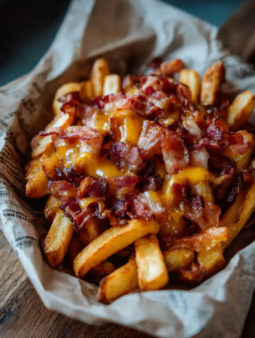 Loaded Bacon Fries steal the show as a game day staple, piled beside burgers or wings for that bar-food vibe. For cultural twists, add chili for a Tex-Mex poutine hybrid or truffle oil for upscale flair—perfect for Super Bowl parties or tailgates where they serve 6 as a hearty side. Pair with burgers and beer for casual dinners.