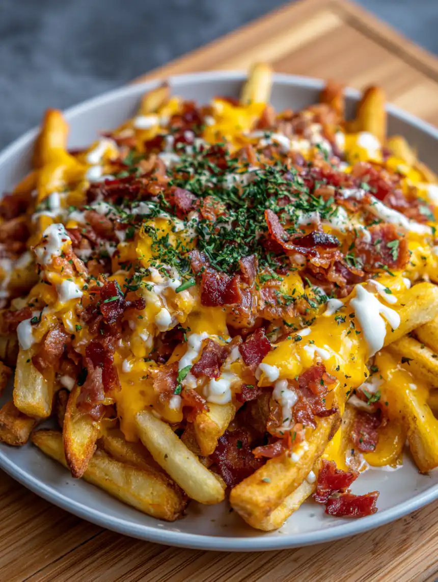 Crispy baked fries topped with melted cheddar, bacon crumbles, sour cream, and green onions for the ultimate loaded snack. Perfect for game days or casual dinners. Restaurant-quality at home in under an hour.